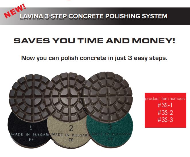 Specialists from Superabrasive introduced a new system of concrete polishing in only 3 steps. New hybrid diamond pads are called 3S-1, 3S-2, 3S-3. The news it mean that one tool are few gradations of micro diamond. It will reduce polishing steps and increases efficiency tools.