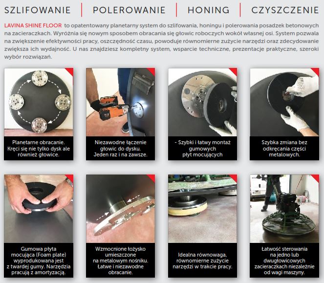 LAVINA SHINE FLOOR is a patented planetary system for grinding, honing and polishing concrete floor. It is distinguished by a new way of rotating the working heads around its axis. The system allows you to increase work efficiency, save time, even wear tools and significantly increase their efficiency. You can find a complete system, technical support, practical demonstrations, a wide range of solutions. You have the option to choose the type of diamond tools, various work patterns step by step. This choice depends on the quality and hardness of the concrete and the investor's expectations. Fresh concrete (up to 28 days) will always be more abrasive, which will result in higher tool wear per m2. When regenerating and cleaning the old concrete floor, pay attention to the evenness of the surface. The floor should be even, without holes and large voids. Grinding and polishing must be done wet, except for the last one or two steps (buffing and troweling of impregnants). After each grading, the concrete should be collected with a washing machine. During work, it is necessary to use two types of chemicals - a hardener for concrete surfaces and a protective impregnation.
